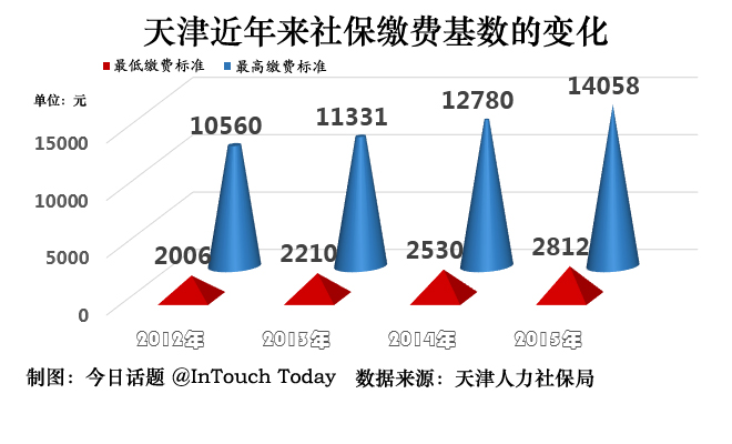 社保缴费基数是一道坎,一般而言,它有两个标准,最高标准与最低标准。如果一个人的工资是在最高和最低标准之间,则按照自己上一年的月平均工资乘以缴费率来缴费;倘若一个人的工资大于最高标准,则按照最高标准来缴费,多出部分不缴钱;更关键的是,如果一个人的工资是低于最低标准的,那么得按照最低标准来缴钱。比如说,天津刚刚公布的2015年最低标准是2812元,而天津目前的最低工资是1680元,这意味着收入在1680元——2812元这个工资区间的人群都得按照2812元乘以缴费率来算应该上缴的费用,而不是以他们的实际工资作为基数。用2500元来举例,拿这个工资的人,应该上缴的个人账户养老金为225元(2812×8%),相当于自己工资的9%。而如果一个人工资是2000元,上缴的同样是225元,光是上缴到个人账户的养老金就会占到自己工资的11.25%。要知道,这还仅仅是从工资里扣到的个人账户里的钱。大家还需要承担的医保、失业、工伤等等其它社保项目,都是以这个基数来算。甚至,很多地方要求,企业交的那部分也是以社保缴费基数为基础。羊毛出在羊身上,企业的负担重了,自然员工的薪酬福利很可能会小,甚至有的效益不好的企业还会千方百计逃费。
