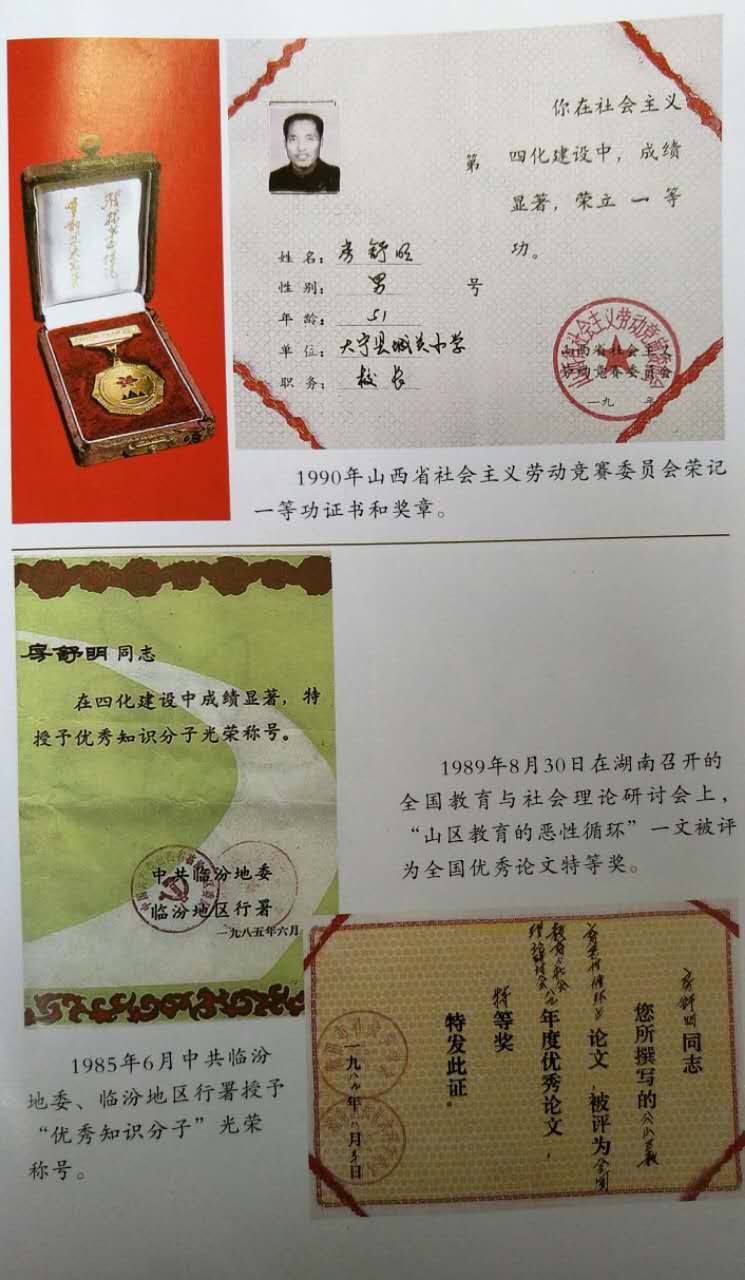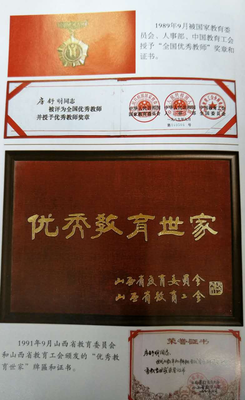 1989年9月被国家教育委员会、人事部、中国教育工会授于“全国优秀教师”奖章和证书。? 1991年9月山西省教育委员会和山西省教育工会颁发的“优秀教育世家”牌匾和证书。